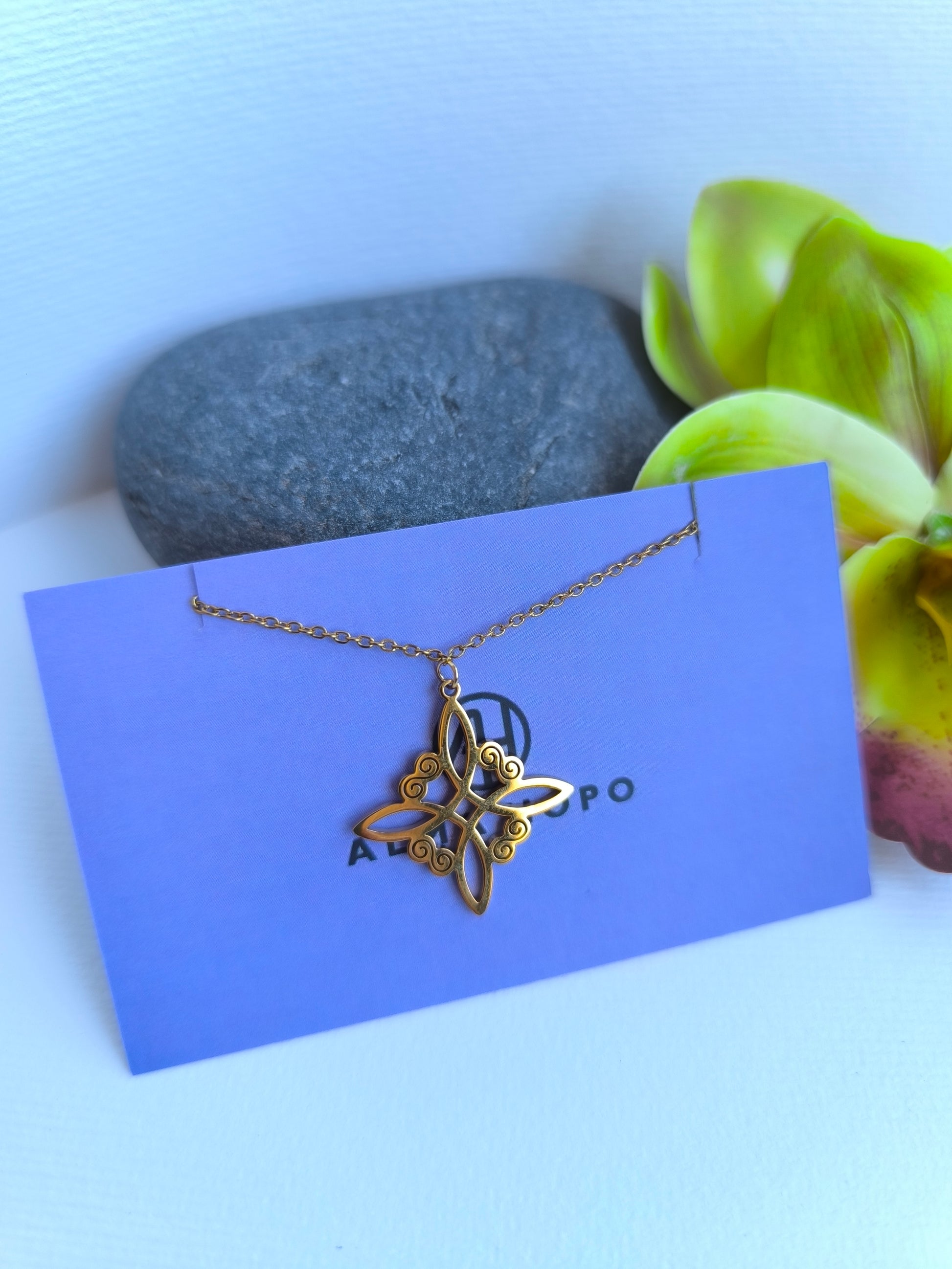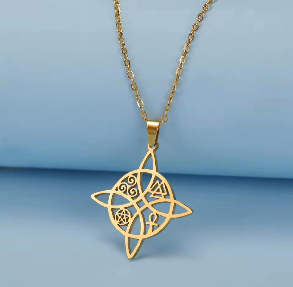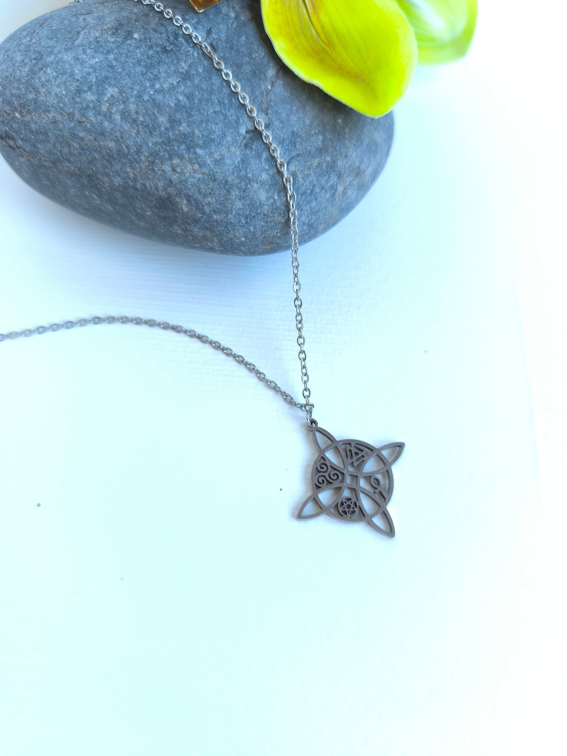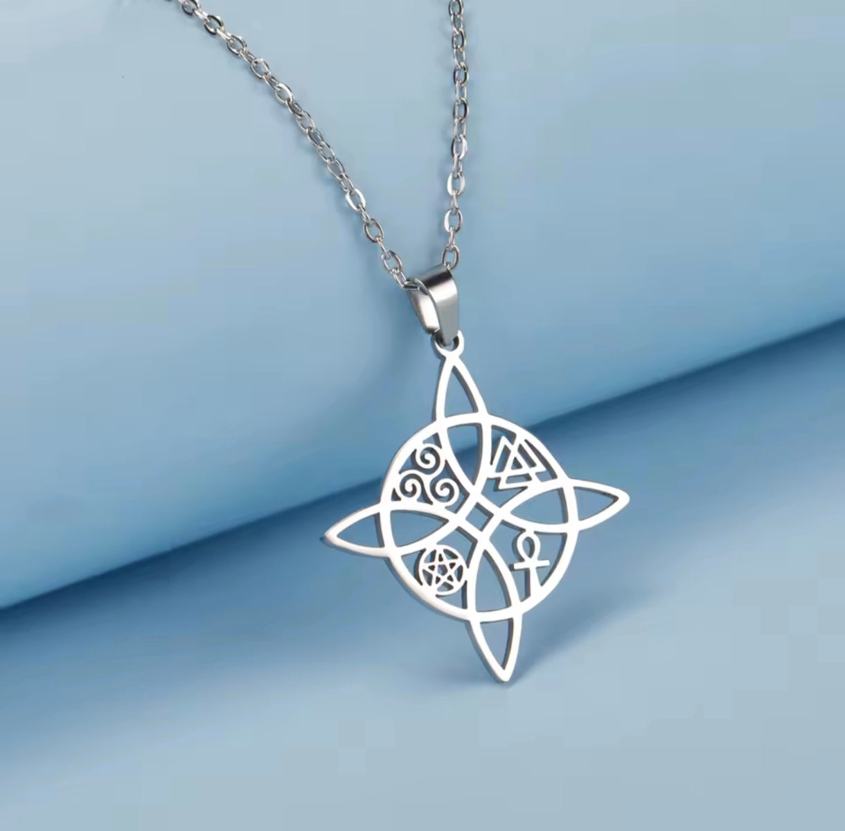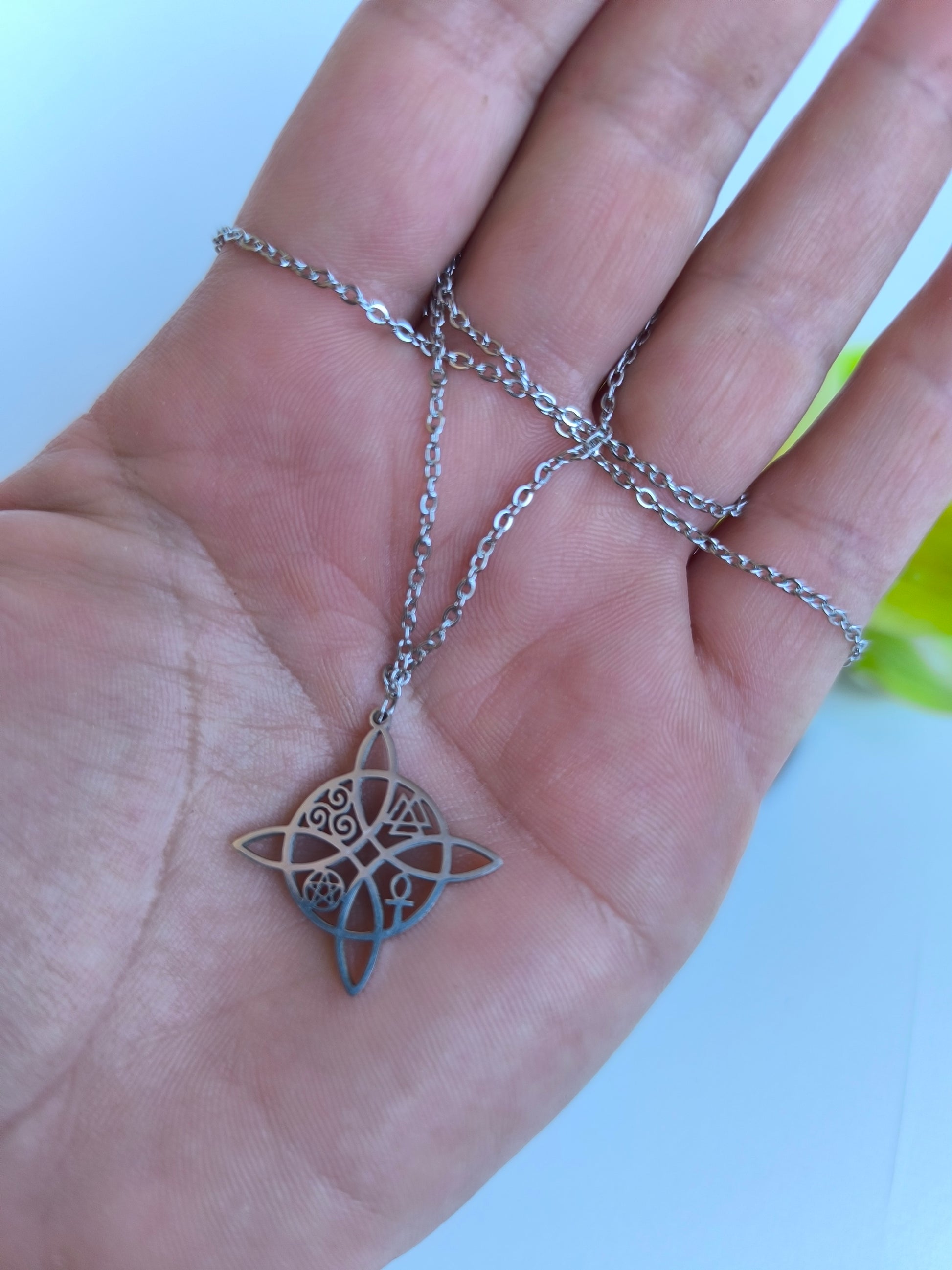 Collar de acero inoxidable con dije en forma de nudo de bruja celta, símbolo de protección, conexión y energía espiritual. Su diseño geométrico y elegante lo convierte en una pieza única, ideal para quienes buscan un amuleto con significado o un accesorio místico que complemente cualquier look.